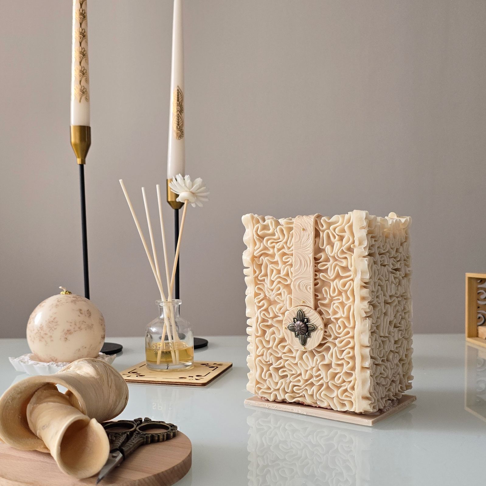 Zedel sveća nosi u sebi snažnu bazičnu osnovu – impresivni pravougaonik od voska, stvoren da dominira prostorom. Njena forma je monumentalna, teška oko 1000 grama čistog voska, što joj daje stabilnost i moćnu prisutnost.Ali ono što je čini posebnom jeste to da nije zatvorena forma – njen dizajn možeš korigovati i oblikovati prema svom senzibilitetu. Na tu kubičnu bazu mogu se dodavati i voskane dekoracije, detalji i personalizacije, što svaku sveću čini jedinstvenim komadom.